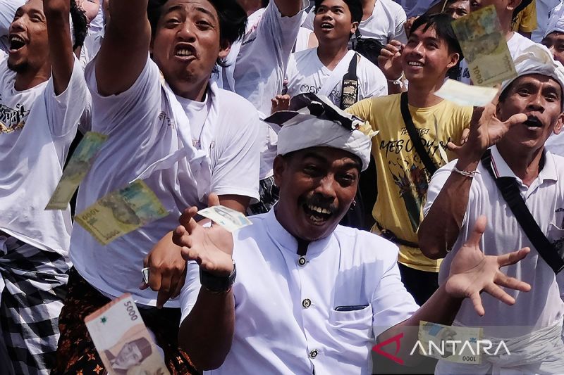 Warga berebut menangkap uang yang dilemparkan saat tradisi Mesuryak di Desa Bongan Gede, Tabanan, Bali, Sabtu (12/8/2023). Tradisi yang digelar setiap Hari Raya Kuningan tersebut diikuti ratusan pemuda dan warga desa setempat …