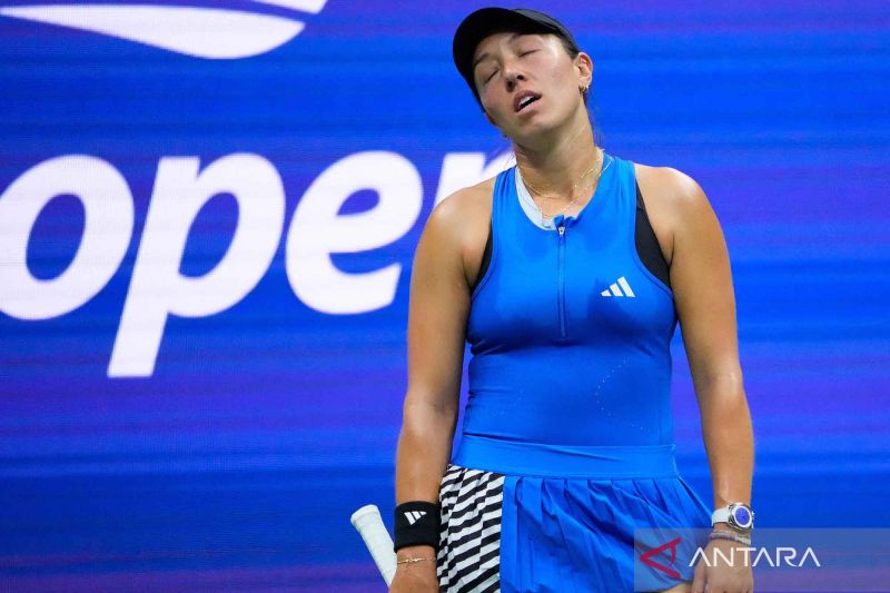 Petenis Amerika Serikat Jessica Pegula berekspresi setelah ketinggalan poin dari lawannya yang juga petenis rekan senegaranya Madison Keys dalam pertandingan babak 16 besar Turnamen Tenis U.S. Open 2023 …