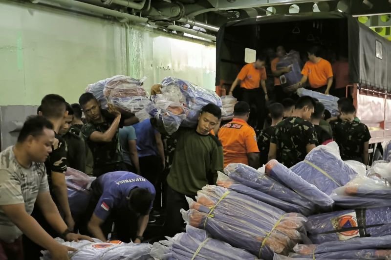 Badan Penanggulangan Bencana Daerah (BPBD) Jawa Timur mengirimkan ribuan terpal kepada pengungsi gempa di Pulau …