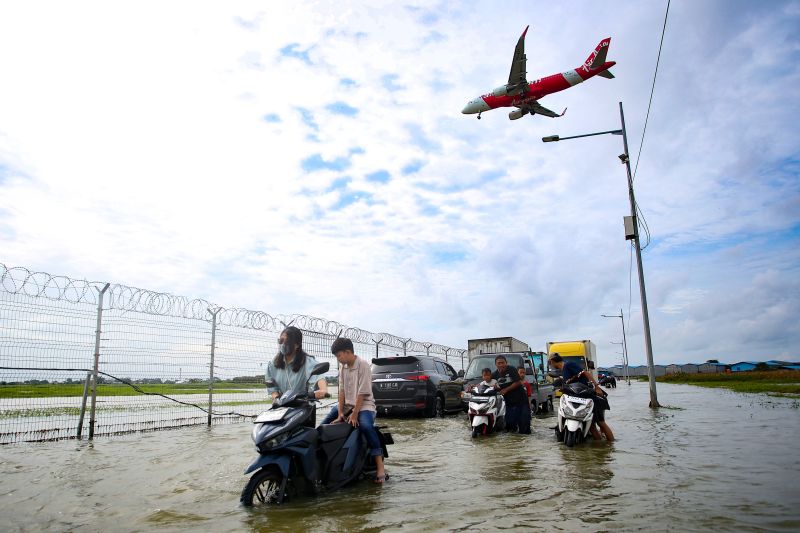 Pengendara motor mendorong motornya yang mati mesin karena menerobos banjir yang merendam Jalan Parimeter Utara Bandara …