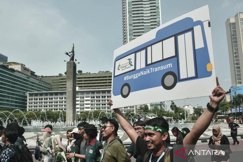 Sejumlah aktivis dari Koalisi Emisi Bebas Emisi 2050 menggelar aksi pada Hari Bebas Kendaraan Bermotor (HBKB) di …